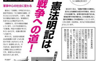 11・3全国労働者総決起集会 改憲阻止・1万人大行進へ! 11月3日 12時~ 日比谷野外音楽堂 安倍は、「大変高いハードルだが、自民党総裁としてその責任を果たさなければならない」と、今臨時国会を「改憲国会」として臨んでいる。自民党憲法改正推進本部は、全国で改憲の必要性や、「改憲気運の醸成や... 2019.10.17