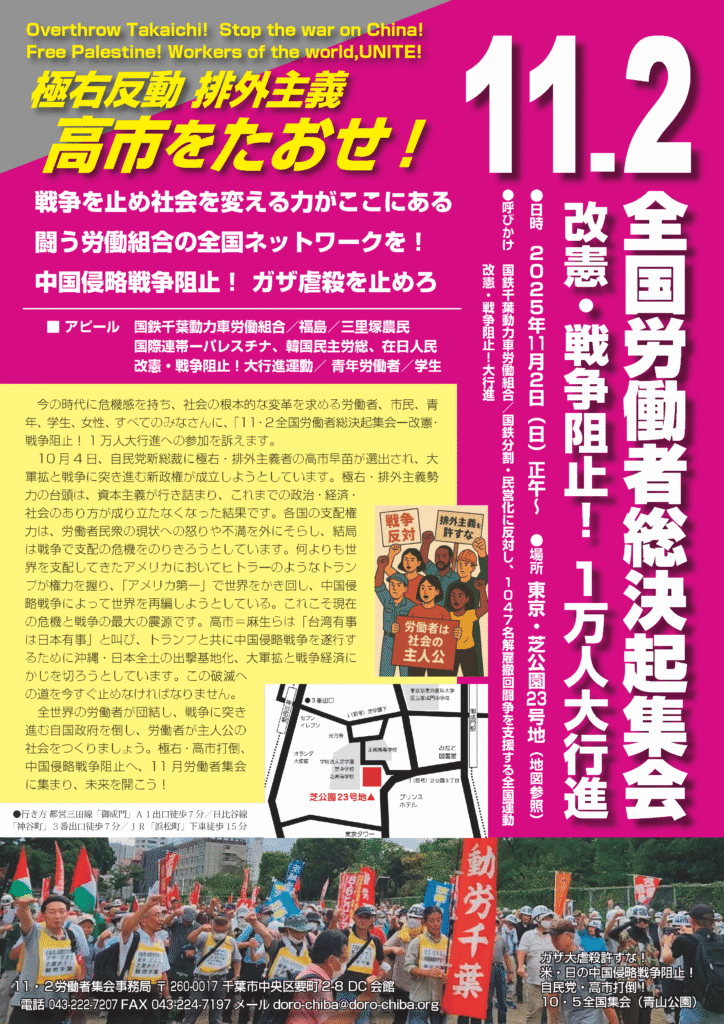 11.2全国労働者総決起集会 第3弾ビラ 11月労働者集会 2025.10.15 PDF 2025年 11.2全国労働者総決起集会/改憲・戦争阻止!1万人大行進11.2全国労働者総決起集会/改憲・戦争阻止!1万人大行進◯11・2集会ビラ第3弾PDF◯11・2集会ビラ第2弾PDF第2弾ビラ◯11・2集会ビラPDF◯多言語対応ビラ◯呼びかけ文PDF〇賛同用紙PDF11月集会過去記事2024年 11.3...