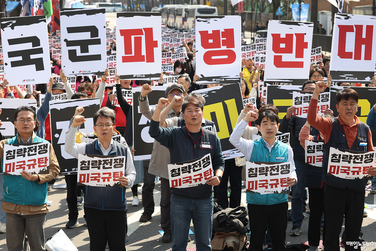 民主労総組合員たちが25日大統領府前で米国・イスラエル侵略戦争糾弾!派兵反対!決意大会をしている。 출처 : 매일노동뉴스(https://www.labortoday.co.kr)