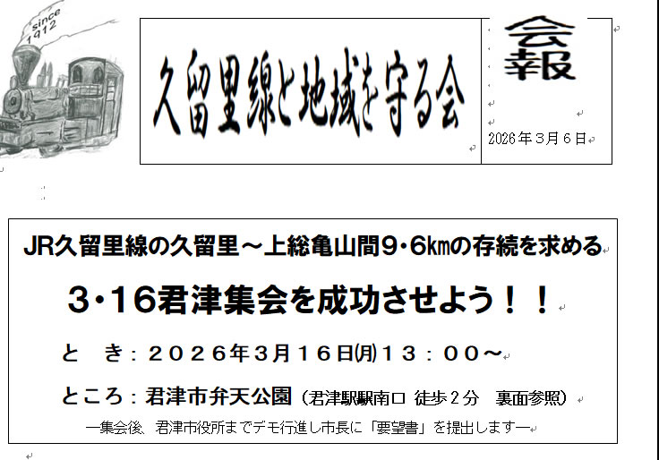 こうした中で久留里線と地域を守る会は、左記のとおり、3月16日に、君津市内において集会を行い、君津市に対するデモ行進を行った後、同市への要請行動を行うことを決定し、参加を呼びかけている。全力で結集し、久留里線・久留里~上総亀山間の廃線届けを撤回させよう!