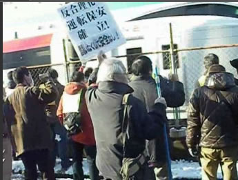 ![]() 足下に雪が残る中、幕張車両センターでの点呼を直撃する怒りの声を叩きつける動労千葉組合員と支援する会の仲間達。(2月2日) |
